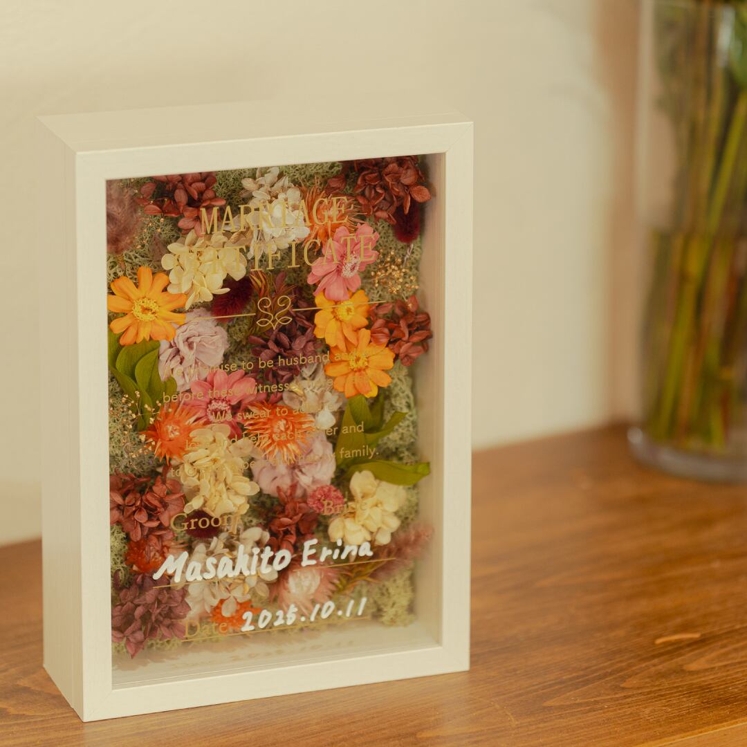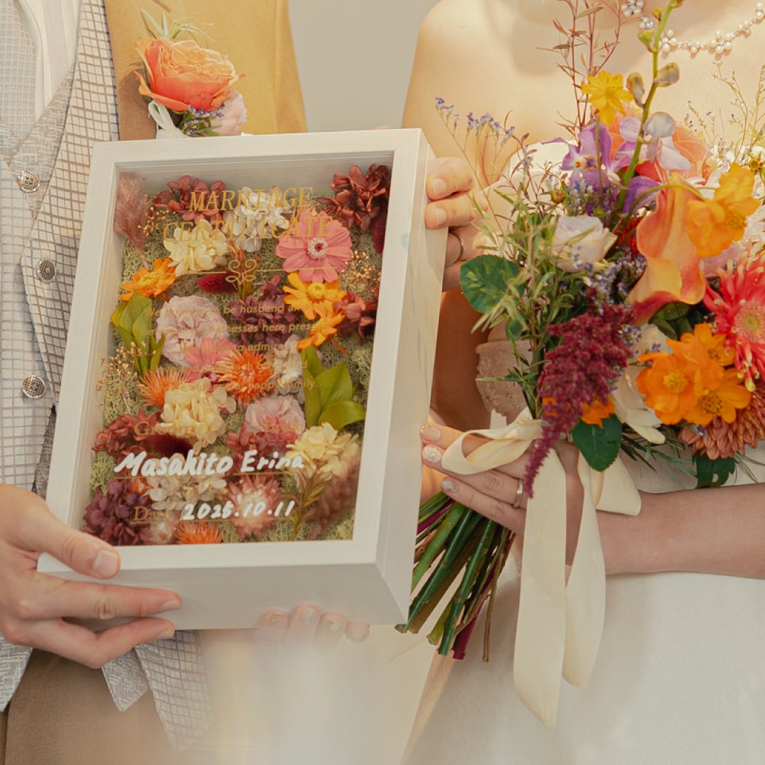 仕上げに新郎新婦もお花を挿すか、アクリル面への署名で仕上げとなります。